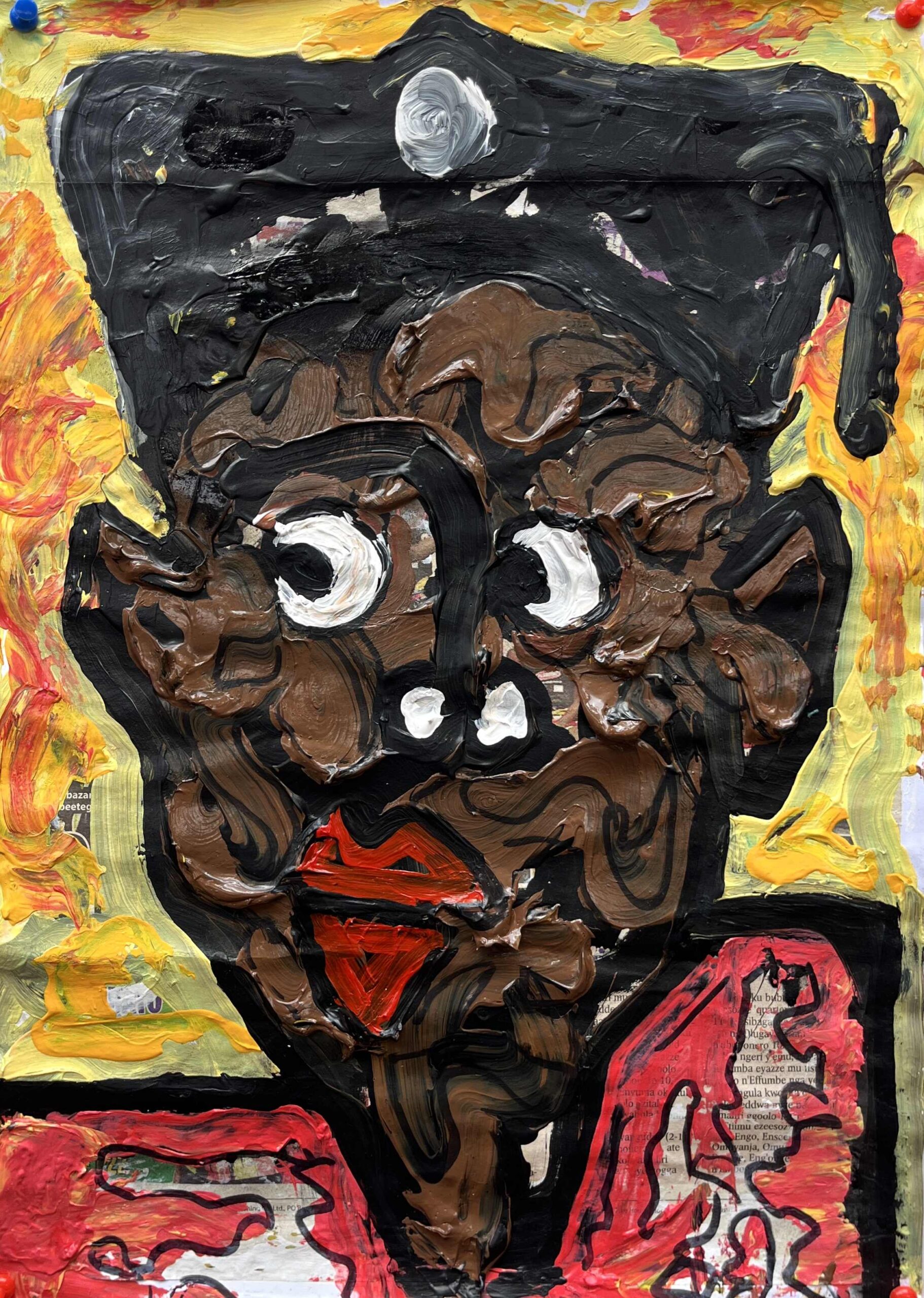 Created as part of his experimental series Blue, Yellow, Red, this mixed-media piece combines newspaper print and acrylic on fused paper, exploring contrast, texture, and layered narrative.