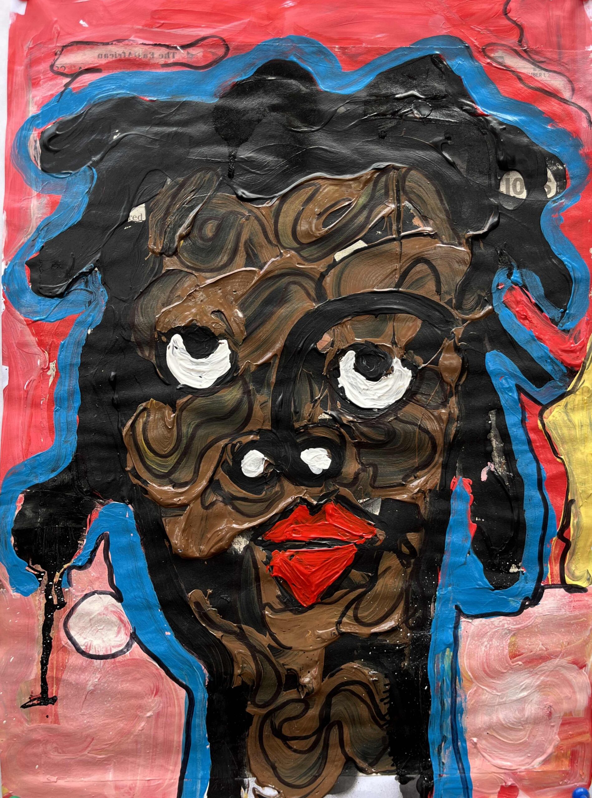 Created as part of his experimental series Blue, Yellow, Red, this mixed-media piece combines newspaper print and acrylic on fused paper, exploring contrast, texture, and layered narrative.